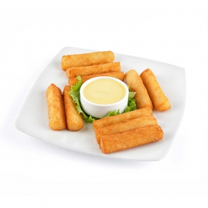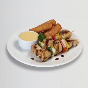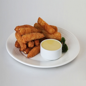 Filetitos de pollo empanizados con yuquitas y salsa honey.