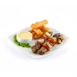 Brochetas de Pollo con Yuquitas fritas y huancaína
