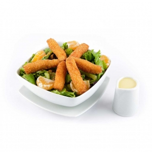 Filetes de pechuga de pollo empanizados, mixtura de lechugas, mandarina, apio, praliné de pecanas acompañadas de aliño honey mustard.