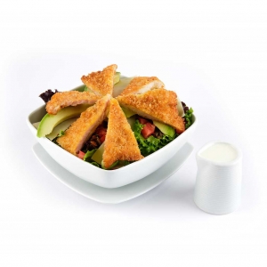 Filetes de pavo empanizados, mixtura de lechugas, tomate, palta, queso parmesano, tocino deshidratado acompañado de aliño de yogurt.