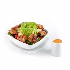 Filetes de pavo en salsa BBQ, mixtura de lechugas, tomate, palta, choclo, cebolla china, chips de tortilla acompañadas con aliño BBQ.