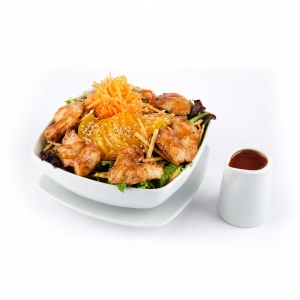 Filetes de pollo a la plancha, mixtura de lechugas, pepinillo, cebolla china, pimiento, holantao, duraznos al jugo, wantán frito, zanahoria, ajonjolí acompañado con aliño agridulce.